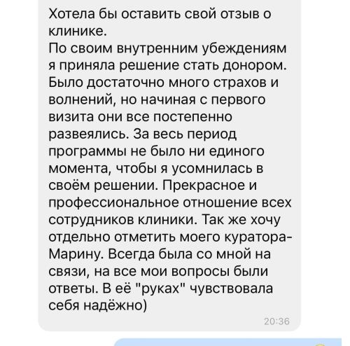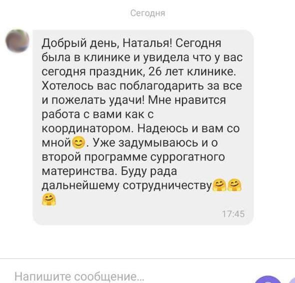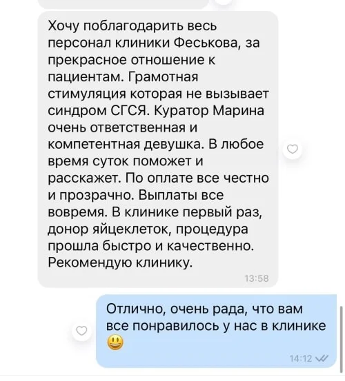 Зараз стільки будь-яких агенцій та клінік репродуктивних. Є надійні, а аферисти. Хотілося, щоб ставлення було добрим і умови теж. Агентства одразу викреслила – вони всі підозрілі, незрозуміло чого чекати. Але й клінік зараз усіляких багато. Довго вибирала, порівнювала ціни та обіцянки. Зрештою пішла в Клініку Феськова, тому що і по грошах і з медицини все зрозуміло і без каверзи. І не пошкодувала! Тут здорово, ставлення ЛЮДСЬКЕ! Мій консультант завжди мені розповідала, пояснювала. Я їй могла зателефонувати будь-якої хвилини. Обстановка в клініці така, що розумієш, що ти робиш дуже важливу та корисну справу. І з оплатою все зрозуміло та без затримок. Платять гідно!